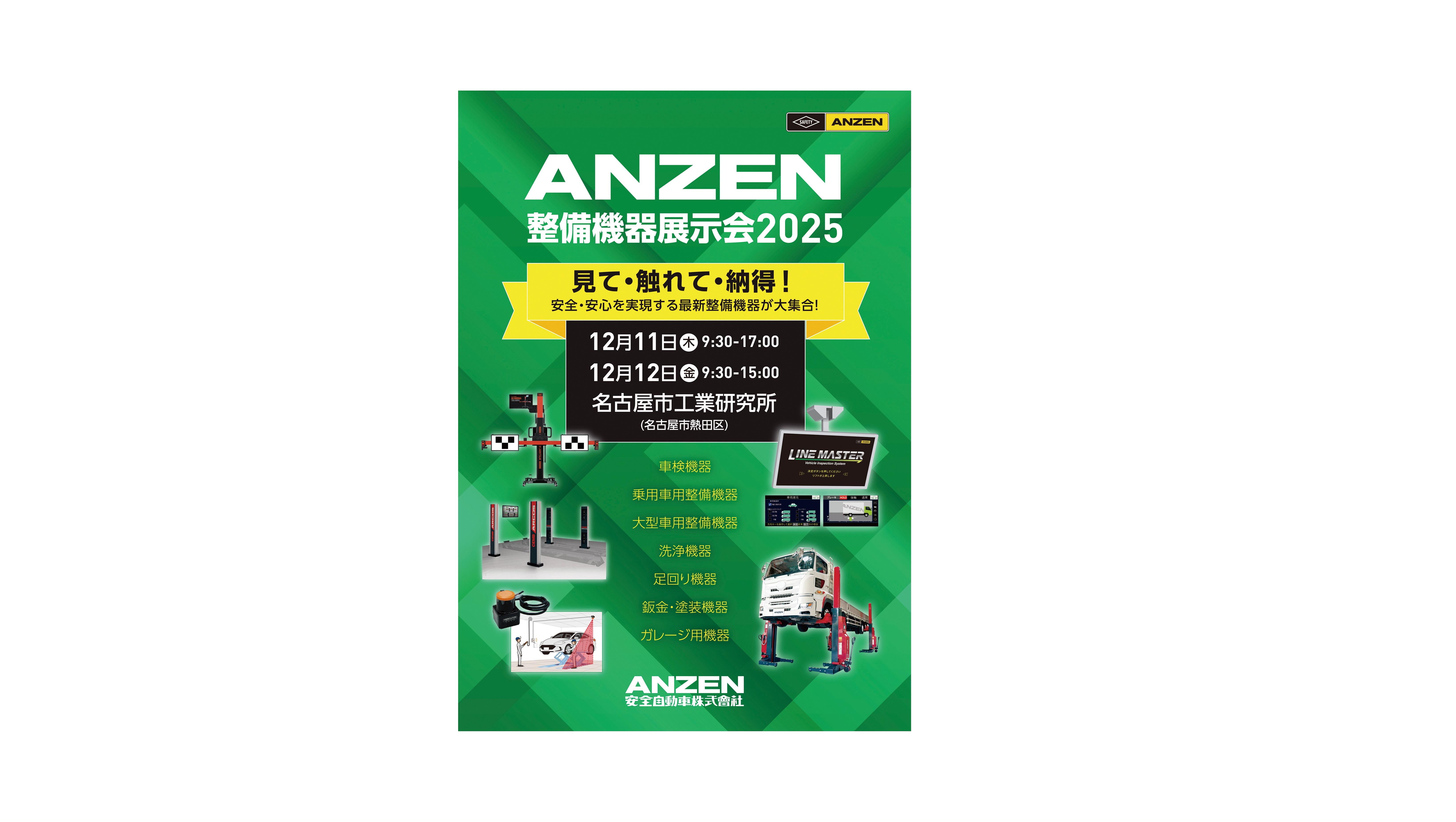 ANZEN 整備機器展示会 2025(会場:名古屋市熱田区)を開催します 最新整備機器と各種セミナーで安全・安心の整備作業場をご提案