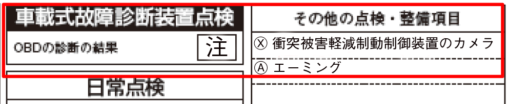 新点検基準の導入により点検整備記録簿が改訂されました。新たに電子制御装置整備の記載欄が加わり、実施した整備についてそれぞれ 記入します。例えば、衝突被害軽減制動制御装置のカメラを交換し、その後エーミング作業を行った場合、チェック欄に注釈の注などを記し、その他の点検・整備項目などの欄に詳細を記載します。交換を示す×の記号を丸で囲み、同様に調整を示すAを丸で囲んでⒶと記載します(下画像参照)。 ANZENニュースVol.1なお従来の点検整備記録簿は「車載式故障診断装置の点検OBDの診断の結果」項目を追加し、記録簿にある「分解」を「特定」に修正すれば10月1日以降も使用することは可能です。