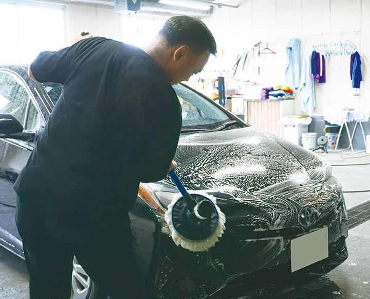 フェンダーやドアは下半身を使い、綱引きのように後退しながら体を動かすと効率的で効果的な洗車が実現(左)