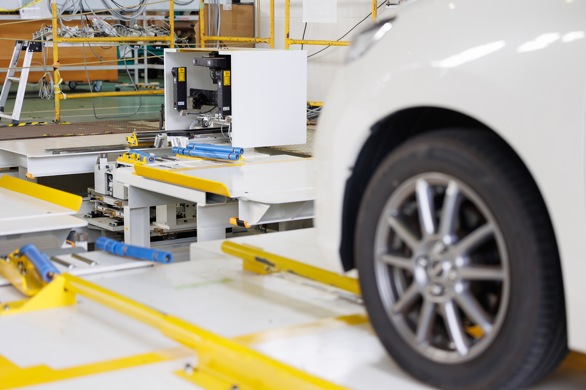完成車のタイヤ取付角度(トー角、キャンバー角)を測定し、調整するための装置